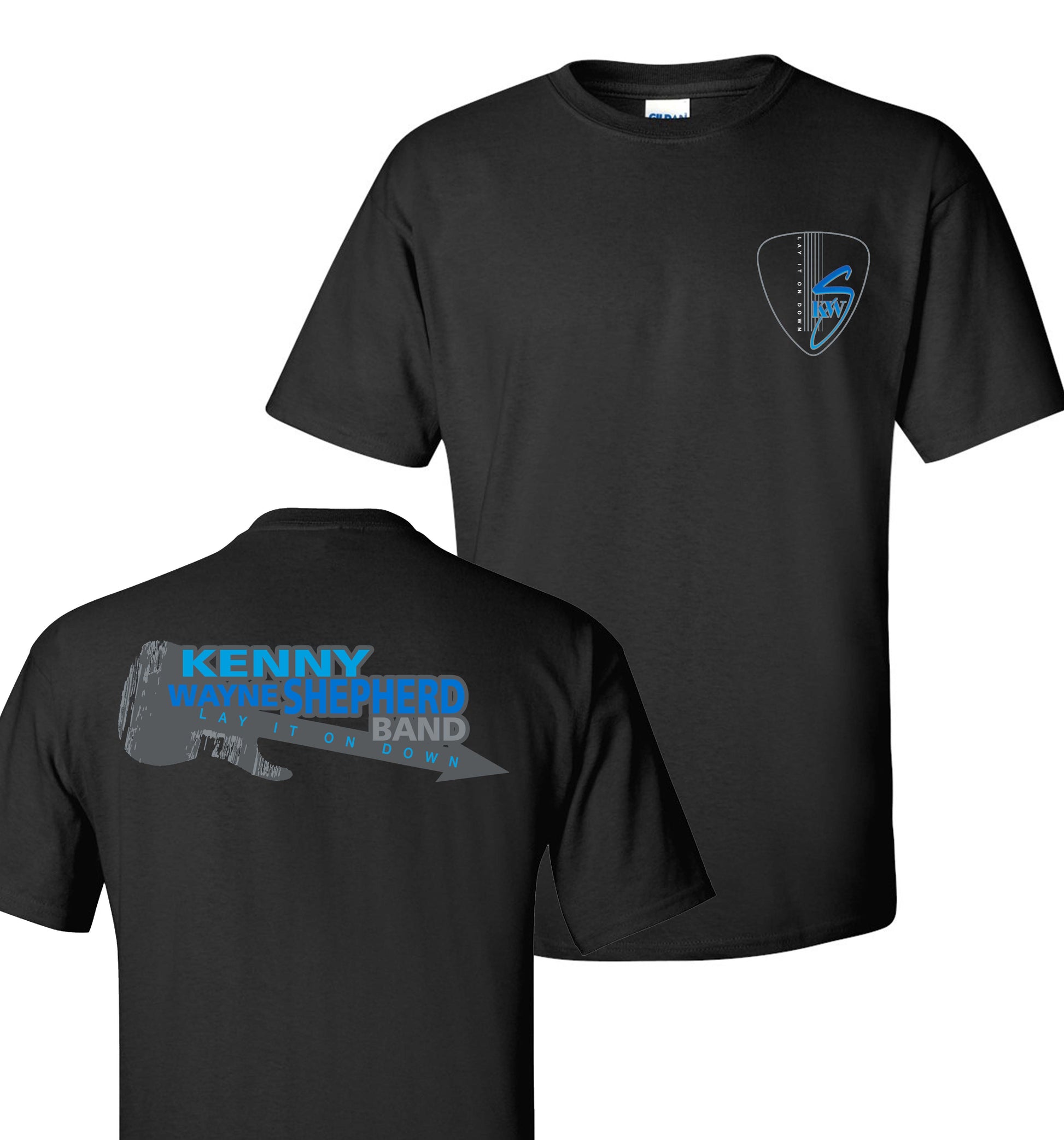 The Lay It On Down short sleeve t-shirt with pick logo on the front and Kenny Wayne Shepherd Band and guitar on back.